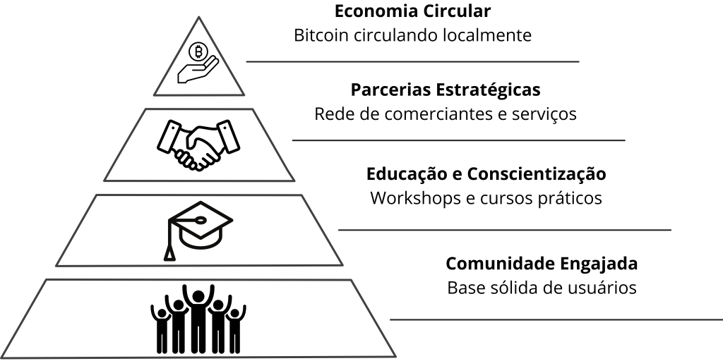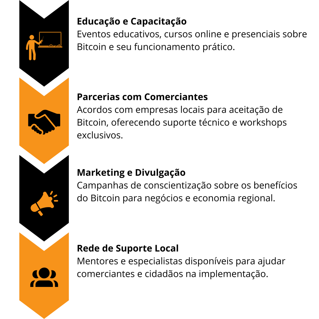 Nossa abordagem multifacetada garantirá que todos os aspectos da adoção do bitcoin e outras criptomoedas sejam cobertos, desde a educação até a implementação prática no comércio local.